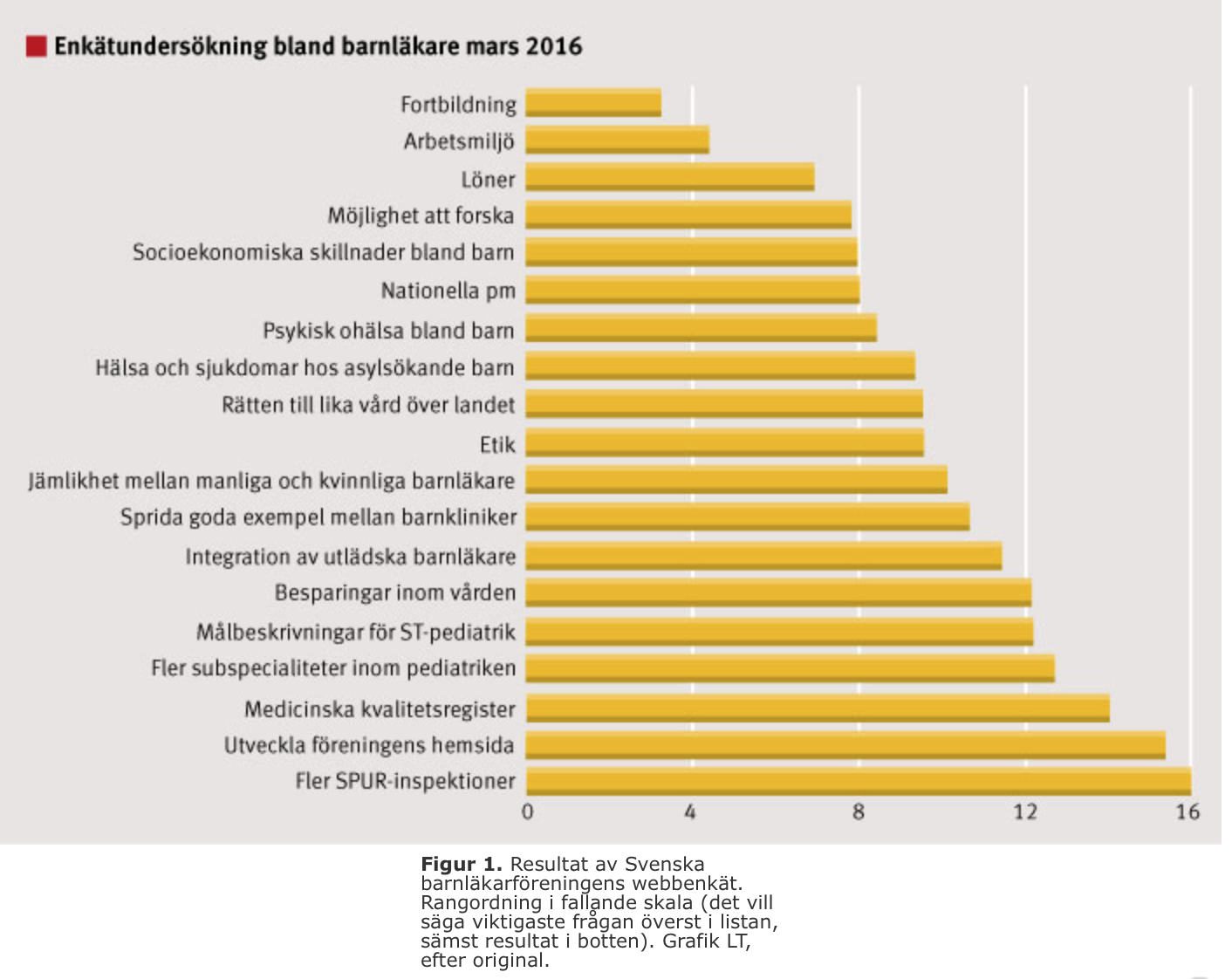 Nära 350 barnläkare har rangordnat frågor inom barnmedicin. Resultaten publiceras i Läkartidningen. Fortbildning ses som en avgörande fråga. Även om undersökningen inte omfattar majoriteten av alla barnläkare ger den en tydlig fingervisning om vilka frågor Barnläkarföreningen, och i förlängningen också Svenska Läkaresällskapet, bör engagera sig i.