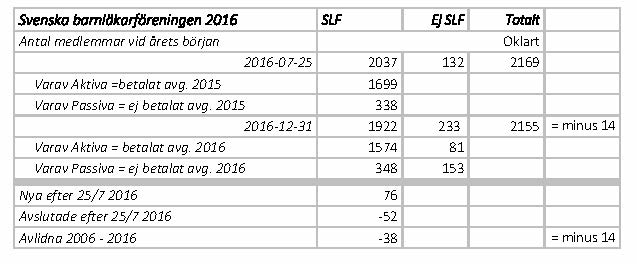 2016 visade ett minusresultat på drygt 1 miljon kronor. Anledningarna är huvudsakligen en försenad och ofullständig medlemsavgiftsöverföring från SLF (cirka 450 000 kr mindre än vanligt) samt en extra debitering från Wiley för tryckning av ACTA Pediatrica på grund av missad debitering 2015 (cirka 500 000 kr extra). BLF:s kostnader för webredaktören ökade 2016 på grund av en avsiktlig medlemsinventering och administration av medlemsavgifter för medlemmar utan samtidigt SLF-medlemskap.